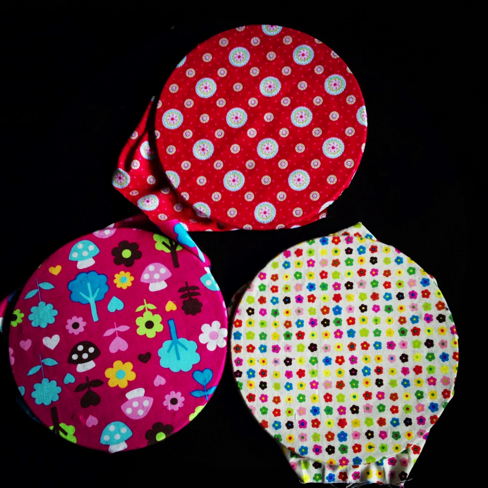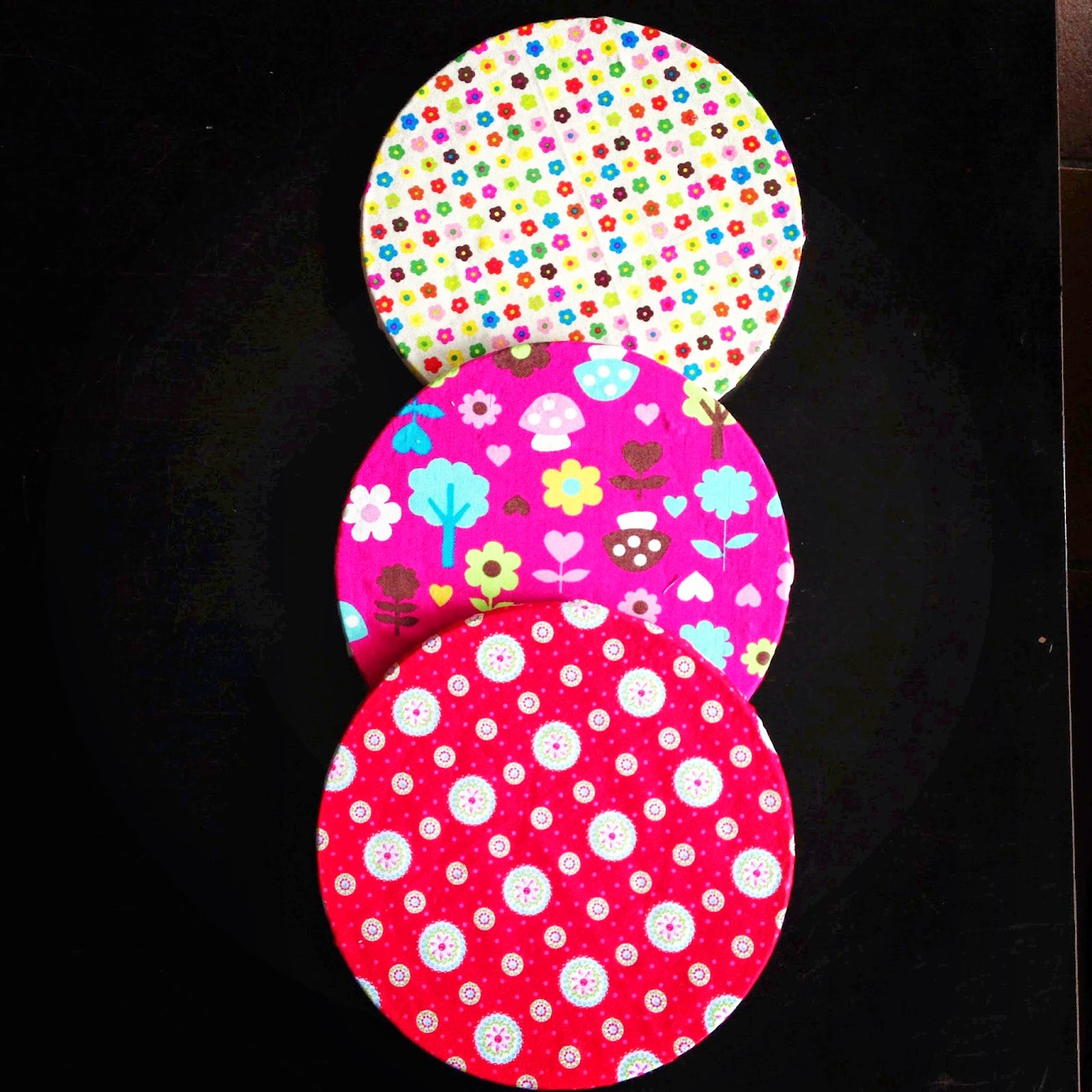Por isso mesmo, quis fazer algo semelhante à caixa feliz, mas para ter à vista e sempre perto de mim. Assim, optei por uns porta recados, que não são mais do que bases de tachos de cortiça (que podemos encontrar em conjuntos de três no IKEA) revestidos com tecido. Simples e fazem um vistão!