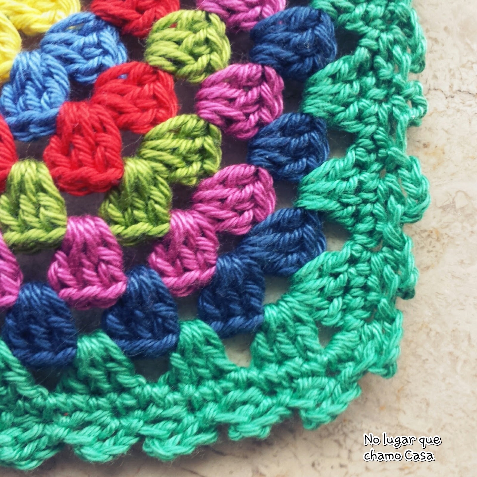 Continue com este esquema, mudando as cores em cada volta e trabalhando (3 pontos duplos, 1 correntinha) em cada espaço e (3 pontos duplos, 3 correntinhas, 3 pontos duplos, 1 correntinha) em cada canto.